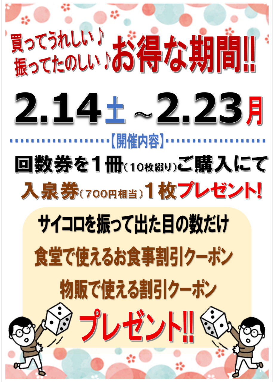 開催期間中に回数券1冊(10枚綴り)ご購入にて入泉券1枚(700円相当)1枚プレゼント!