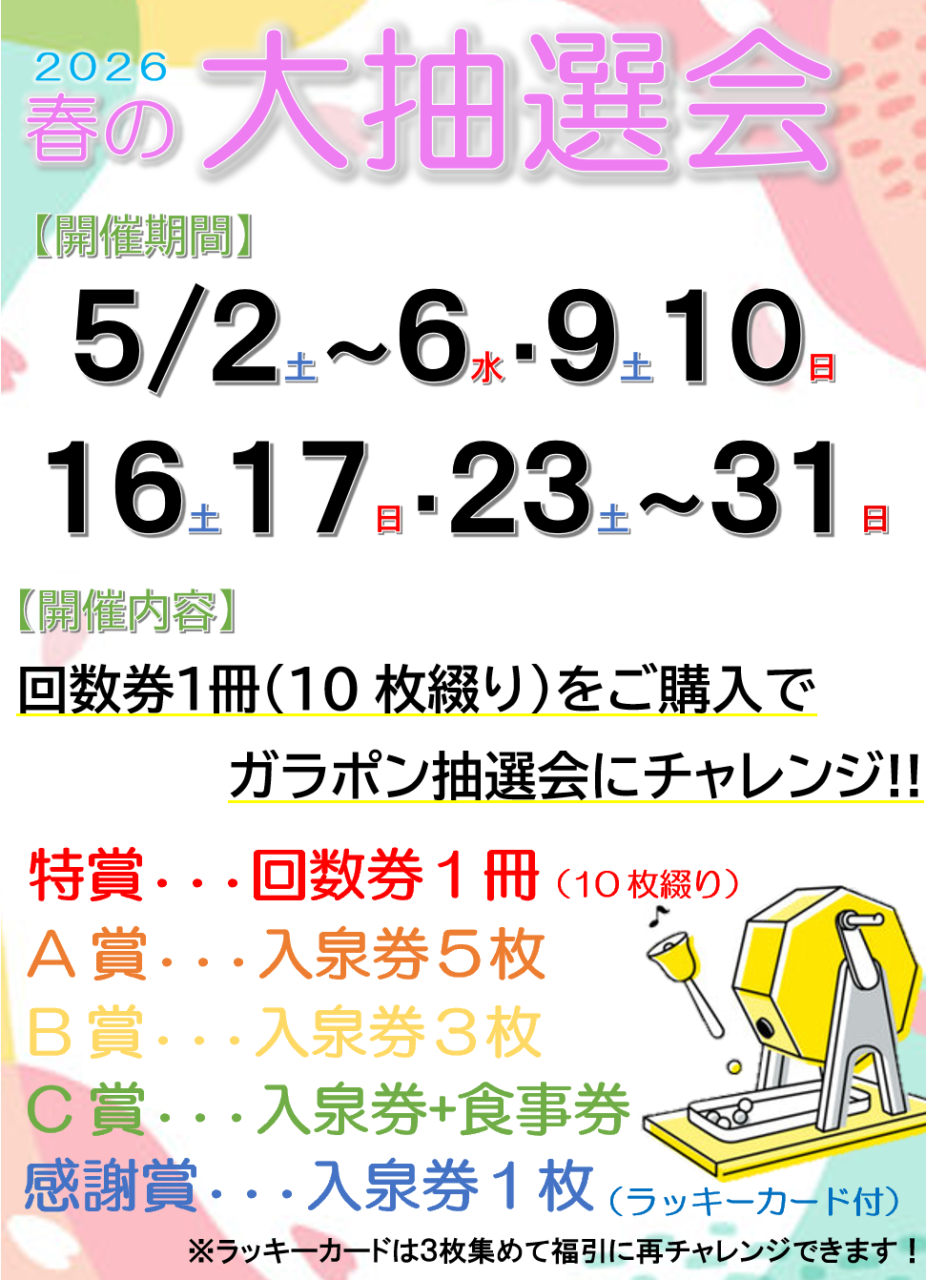 回数券(10枚綴り)を1冊購入ごとに入泉券の枚数が増えるガラポン抽選会のチャンス!!